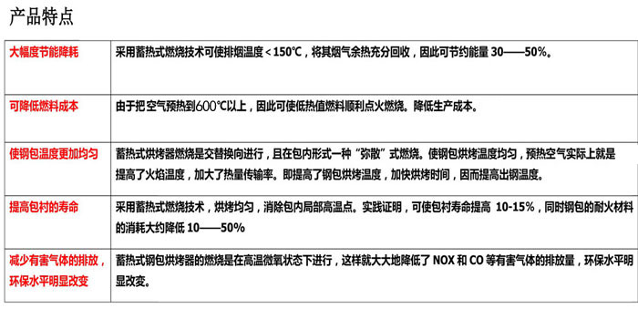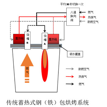 蓄熱烘烤裝置是將高溫空氣燃燒技術應用到鋼鐵企業鋼水包加熱烘烤的裝置。這一技術可使鋼包烘烤溫度達到1100℃以上,從而實現提高出鋼溫度,而且有利于提高鋼坯的內部質量,具有顯著的經濟效益。我們采用了高頻換向閥,使得高溫度廢氣與助燃空氣在陶瓷蓄熱體內交替通過,相互間進行充分的熱交換,使助燃空氣溫度達到800℃以上,増加其熱值,實現穩定燃燒,達到充分節約能量的目的。