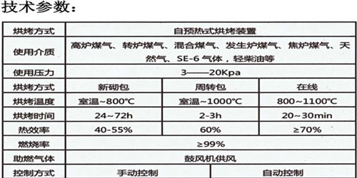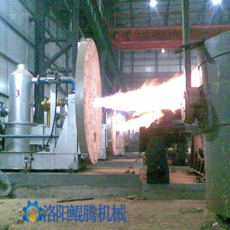 臥式烘烤裝置離線安裝在預(yù)先鋪設(shè)的兩根軌道上。將鋼水罐橫臥在烘烤裝置前固定的鋼水罐支架上。烘烤器沿軌道移動至烘烤位,對鋼水罐進(jìn)行加熱、升溫烘烤。由電動平板車、熱交換器、豎向鋼包蓋等組成,所有部件都固定在電動平板車上,由電機(jī)、減速機(jī)提供動力。助燃空氣由安裝在平板車后部的高壓風(fēng)機(jī)提供,首先經(jīng)熱交換器預(yù)熱,然后再經(jīng)鋼包蓋二次預(yù)熱送入燃燒器熱風(fēng)溫度可達(dá)到500℃以上,車體在預(yù)先鋪設(shè)好的鋼軌上運(yùn)動以調(diào)整包口密封距離和讓開吊運(yùn)空間。